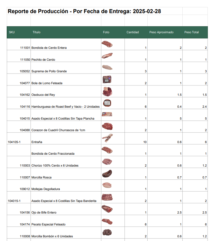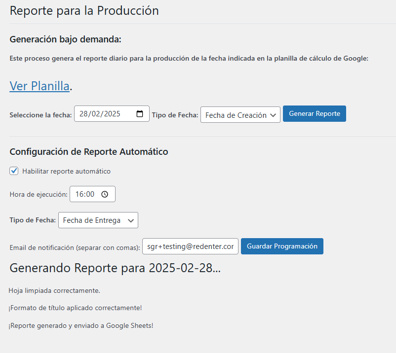 El reporte para la producción genera en una planilla Excel o Google Sheets según la fecha indicada que puede ser